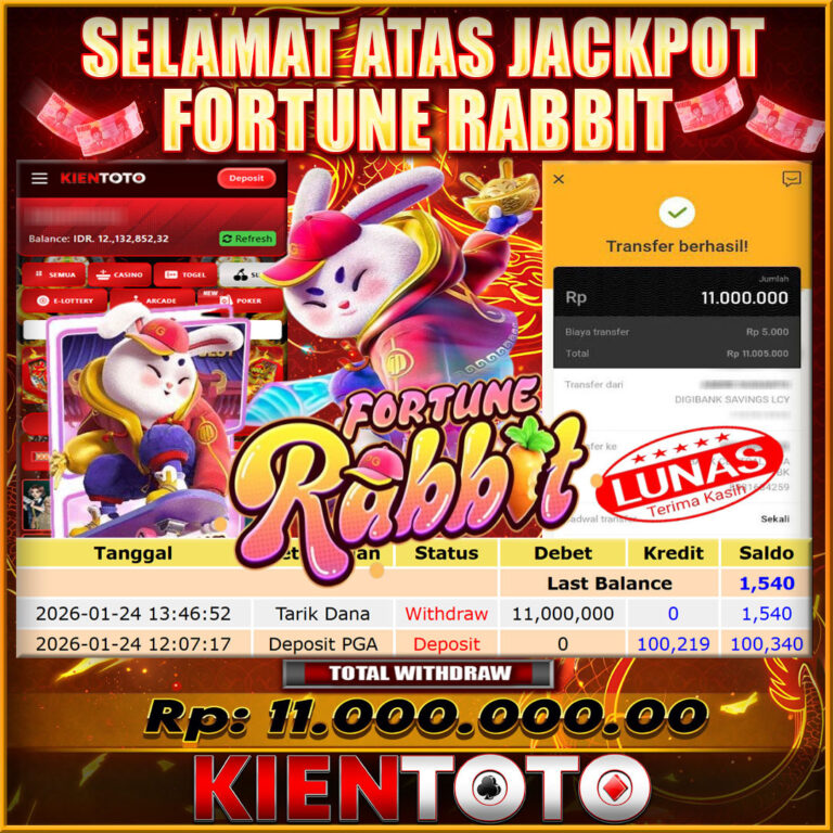KIENTOTO JACKPOT Fortune Rabbit Rp11,000.000- SABTU ,24 JANUARY 2026Selamat kepada User id : fa***2912 Telah berhasil mendapatkan kemenangan besar pada permainanFortune Rabbit kemenangan Sebesar Rp11,000.000, Setelah mengisi formulir withdraw dengan kurung waktu hanya 5 – 10 menit pihak KIENTOTO sudah melakukan transfer kepada pemilik User id dan dana sudah dapat di cairkan oleh pemenang. Bukti…