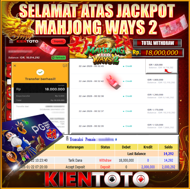 KIENTOTO JACKPOT SLOT Mahjong Ways Rp18.000.000- LUNAS