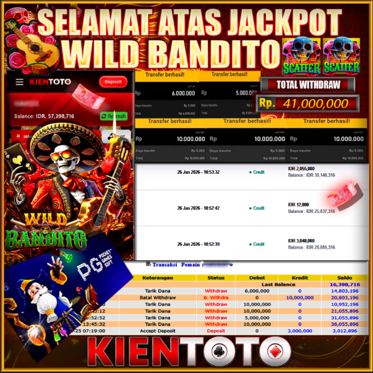 KIENTOTO JACKPOT Wild Bandito Rp41,000.000- SENIN ,26 JANUARY 2026Selamat kepada User id : aba***90 Telah berhasil mendapatkan kemenangan besar pada permainanWild Bandito kemenangan Sebesar Rp41,000.000, Setelah mengisi formulir withdraw dengan kurung waktu hanya 5 – 10 menit pihak KIENTOTO sudah melakukan transfer kepada pemilik User id dan dana sudah dapat di cairkan oleh pemenang. Bukti…
