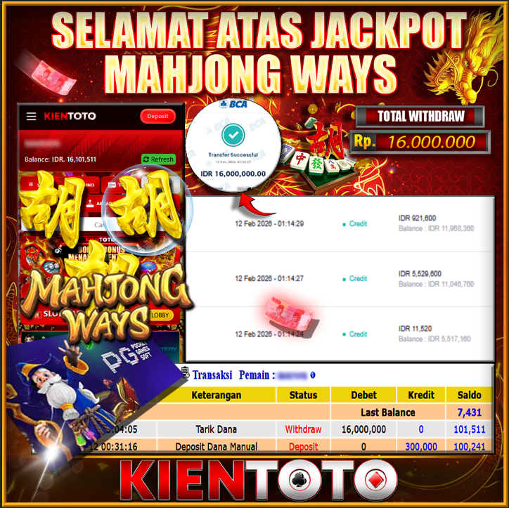 KIENTOTO JACKPOT SLOT Mahjong Ways Rp16.000.000- LUNAS
